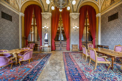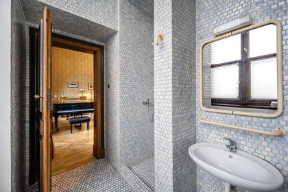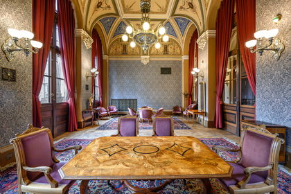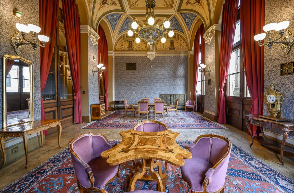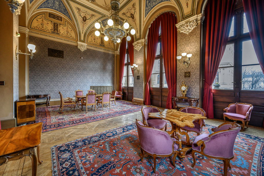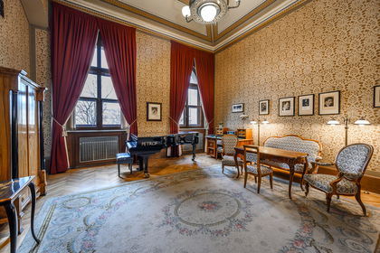 Zůstáváme na balkóně, tentokrát však vpravo. Zde máme salonek s prostornou terasou, který je součástí původního důmyslného vstupu do Rudolfina. Představte si, kterak monarcha či později prezident přijíždí ve voze ke kočárovému vjezdu, vystoupá po schodišti vzhůru a v salonku se před koncertem občerství. Salonek se jmenuje Prezidentský, dodnes slouží především k reprezentačním účelům, a právě proto jeho název zůstává zachován.