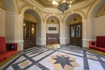 Neměnily se však pouze názvy salonků, komplexní obměnou prochází celý navigační systém v Rudolfinu. Nejprve jsme nechali odstranit všechny nánosy předchozích vrstev označení a rozdíl je okamžitě znát. Ve foyer konečně vyniká krása přírodního kamene i jedinečné výmalby.