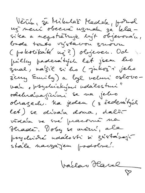 Osobně laděný dopis Václava Havla doprovázel celou výstavu Mikuláše Medka v podobě přílohy katalogu k výstavě, který Galerie Rudolfinum vydala. Havel píše: