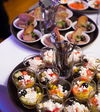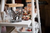 Bary s nápoji a drobnými pochutinami, jako jsou koktejlové chlebíčky nebo mini dezerty.